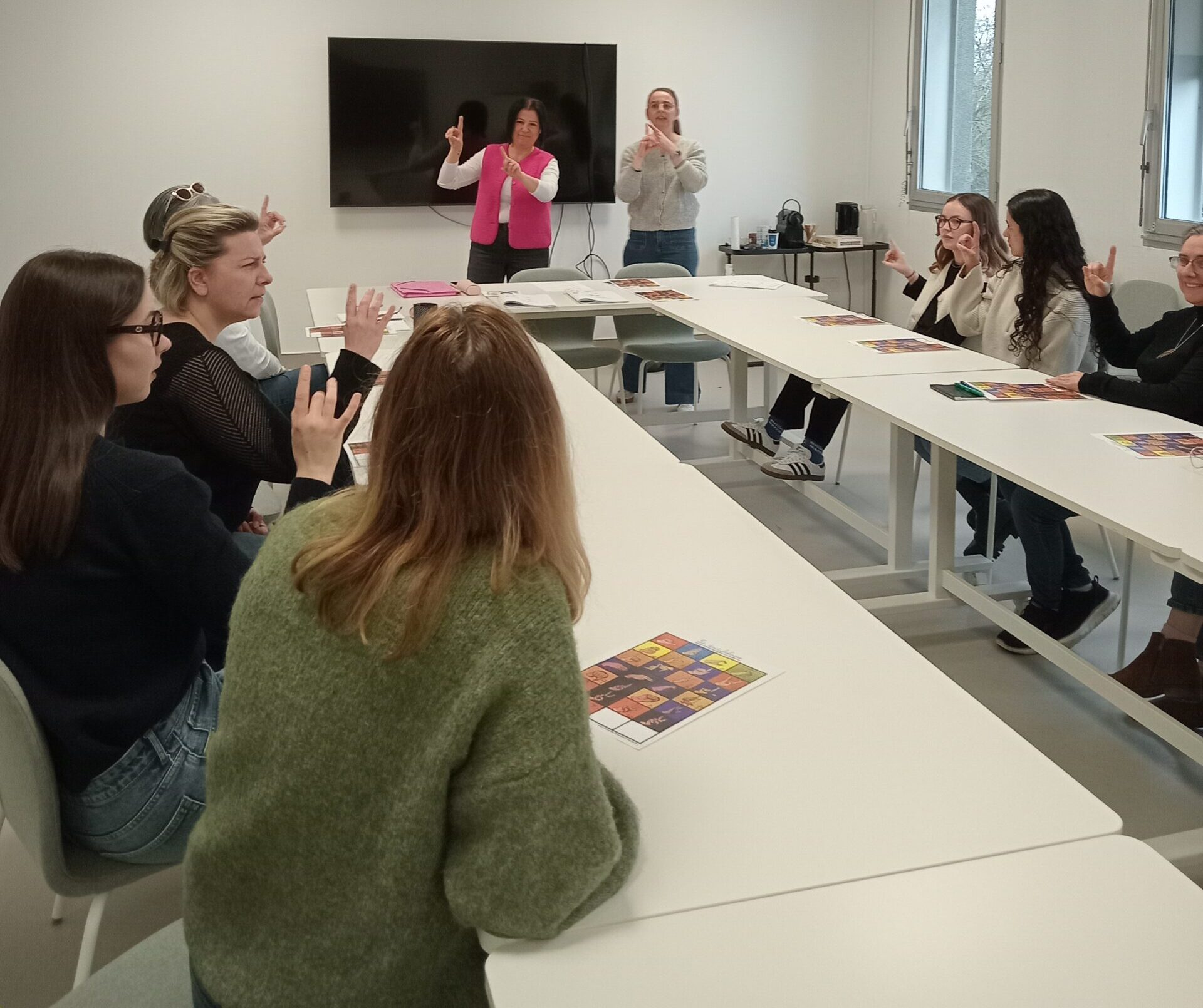 La semaine dernière, plusieurs collègues du siège social dont notre Directrice générale ont participé à une initiation à la Langue des Signes Française (LSF) animée par deux professionnelles de notre établissement de Kerveiza, Bénédicte et Noémie. En tant qu’association accompagnant des établissements du secteur sensoriel, nous avons particulièrement apprécié cette sensibilisation. Un grand merci à Bénédicte et à Noémie pour cette belle initiation et pour le partage de leur expérience 👏