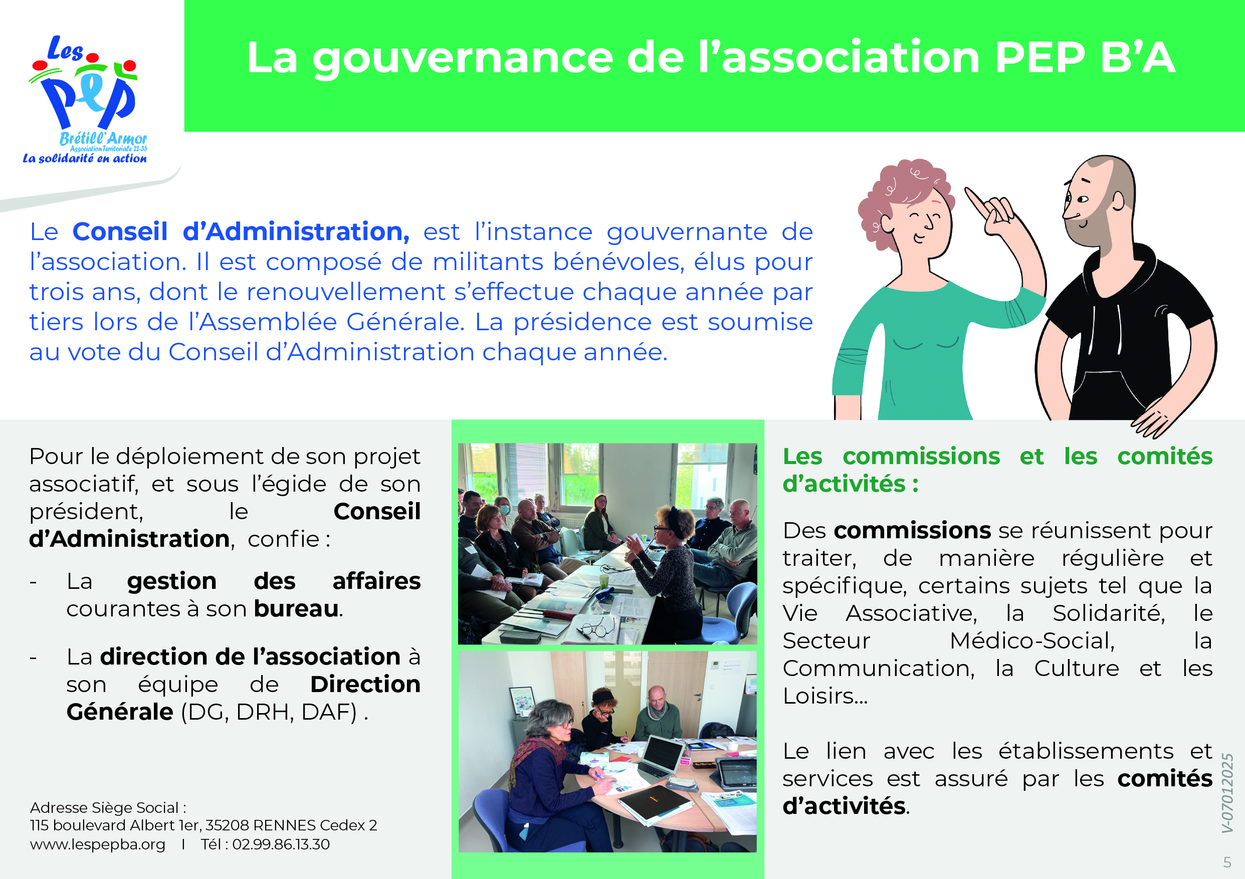 L’association Territoriale des PEP Brétill’Armor est une association à but non lucratif (Loi de 1901). Elle fonctionne selon les règles inhérentes à ce statut, avec les instances suivantes : le Conseil d’Administration, l’Assemblée Générale et le Bureau.