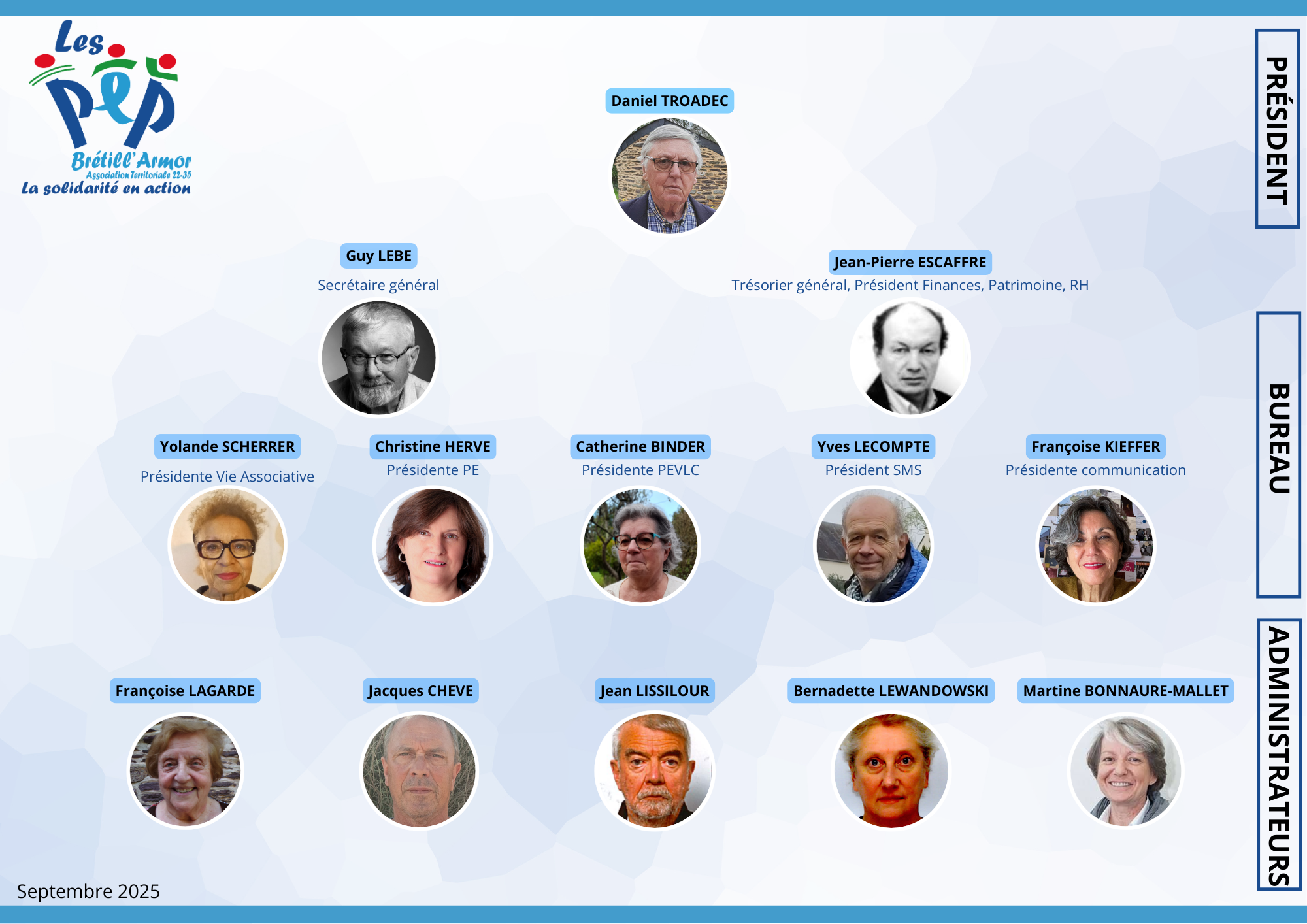 L’association Territoriale des PEP Brétill’Armor est une association à but non lucratif (Loi de 1901). Elle fonctionne donc selon les règles inhérentes à ce statut, avec les instances suivantes : le Conseil d’Administration, l’Assemblée Générale et le Bureau.